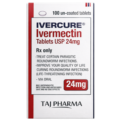 Ivercure 24mg is a brand of Ivermectin manufactured by Taj Pharma Ltd, which is a WHO-GMP certified facility. Each uncoated tablet contains 40mg of Ivermectin USP, and the same active ingredient is used in global health programs that have treated billions of people from parasitic infections since the 1980s.